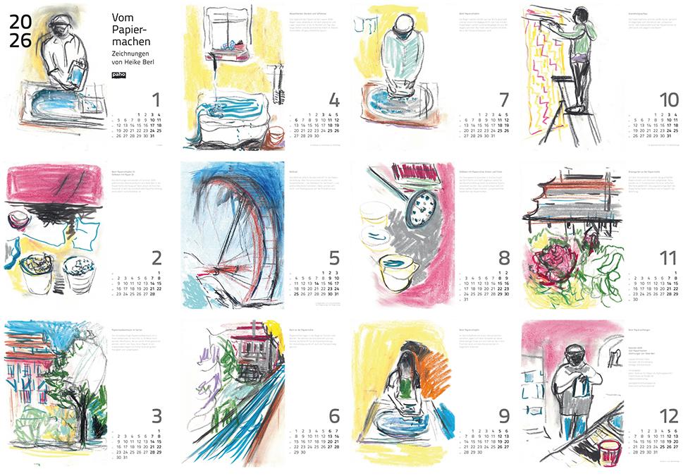 Der paho-Wandkalender 2026 präsentiert Zeichnungen von Heike Berl, die in der Papiermühle Homburg am Main entstanden. Die Künstlerin konnte die Papiermühle in Homburg am Main – ein technisches Denkmal, in dem sich die vorindustrielle Papiermacherei in eindrücklicher Weise nachvollziehen lässt – im Sommer 2025 im Rahmen eines Walzstipendiums kennenlernen.
