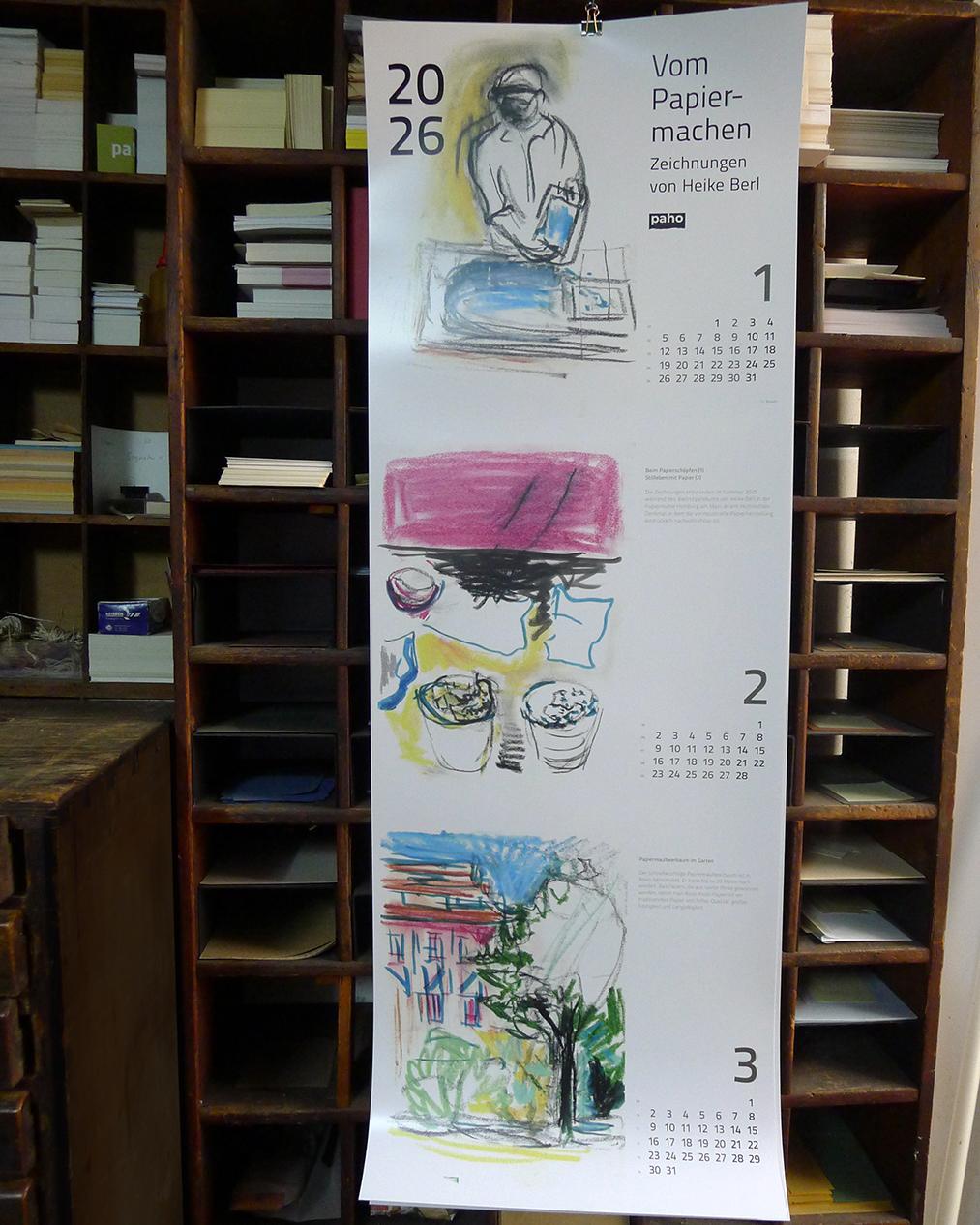 Der Kalender besteht aus zwei Bogen im Format 420 x 1188 mm, die durch eine Klammer gehalten werden, wobei jede der vier Seiten ein Quartal umfasst. Die Zeichnungen werden durch kurze Texte zur Papiermacherei ergänzt. Das Kalendarium ist wochenweise gegliedert.