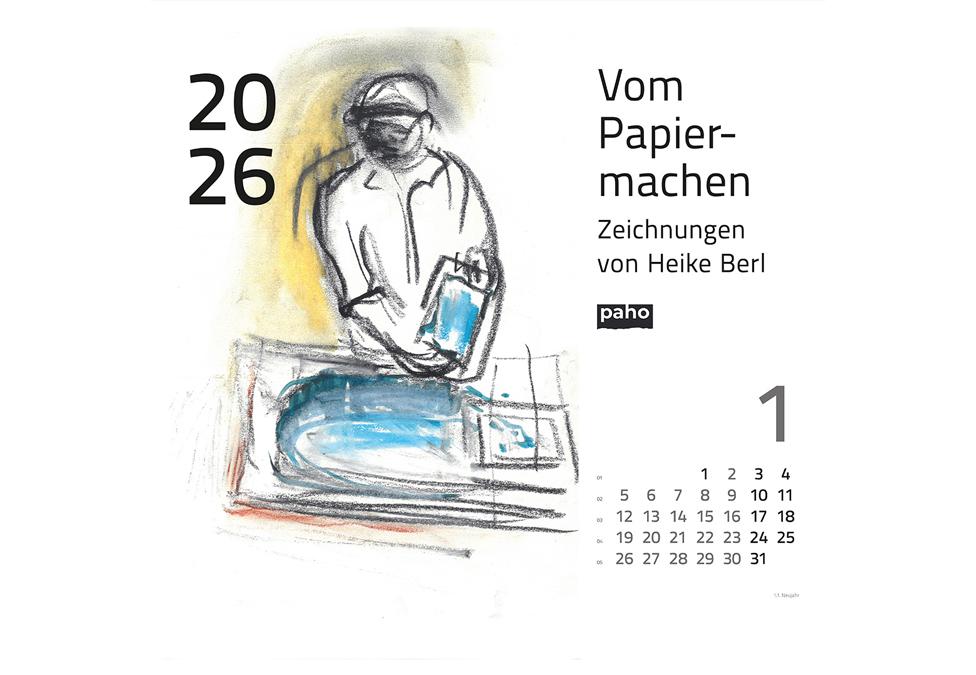 Der paho-Wandkalender 2026 präsentiert Zeichnungen von Heike Berl, die in der Papiermühle Homburg am Main entstanden. Die Künstlerin konnte die Papiermühle in Homburg am Main – ein technisches Denkmal, in dem sich die vorindustrielle Papiermacherei in eindrücklicher Weise nachvollziehen lässt – im Sommer 2025 im Rahmen eines Walzstipendiums kennenlernen.